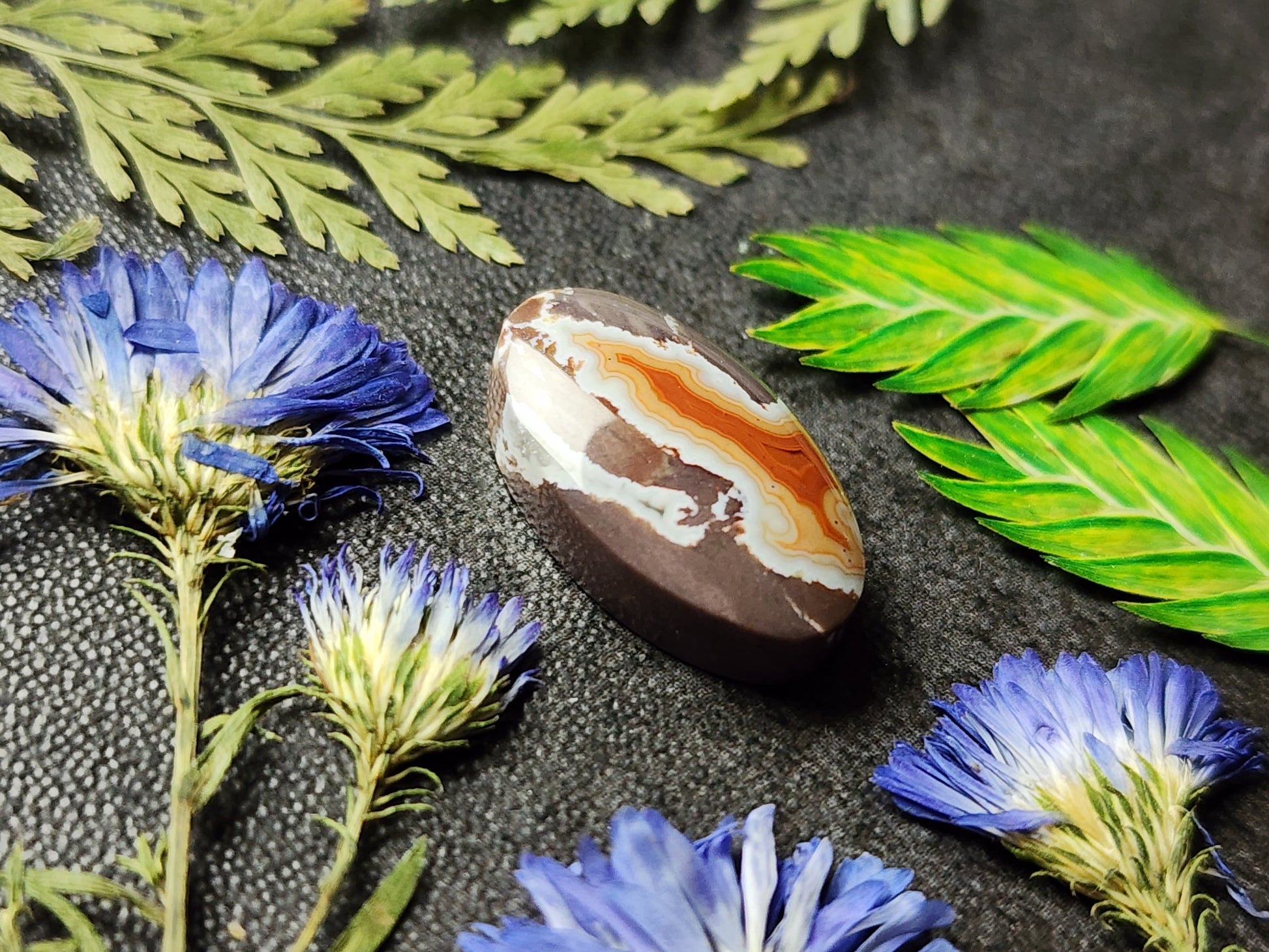 Dryhead Agate — a classic Montana beauty from the Pryor Mountains near Bighorn Canyon, born of fire and time. Layers of honeyed orange, mocha, and ivory twist together like desert canyons at sunset. Each piece tells a quiet story of ancient waters and volcanic ash, sealed away for millennia until now. A timeless American agate — no longer actively mined, and highly collectible.