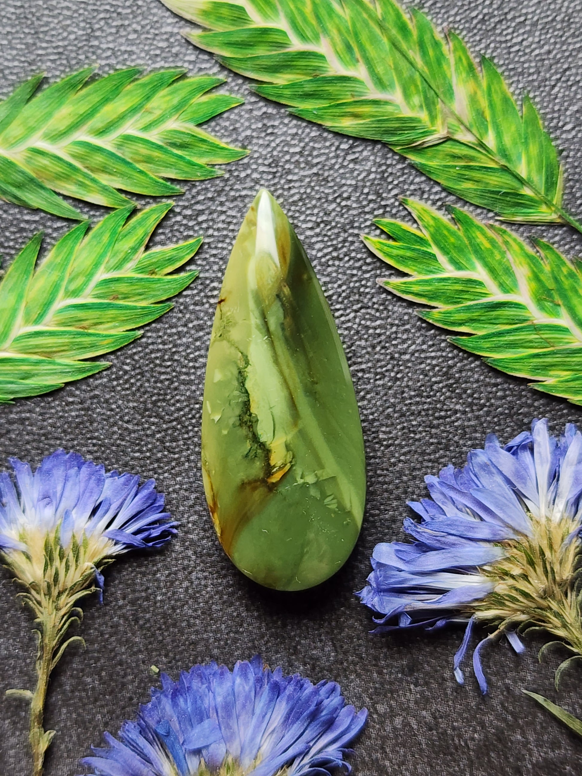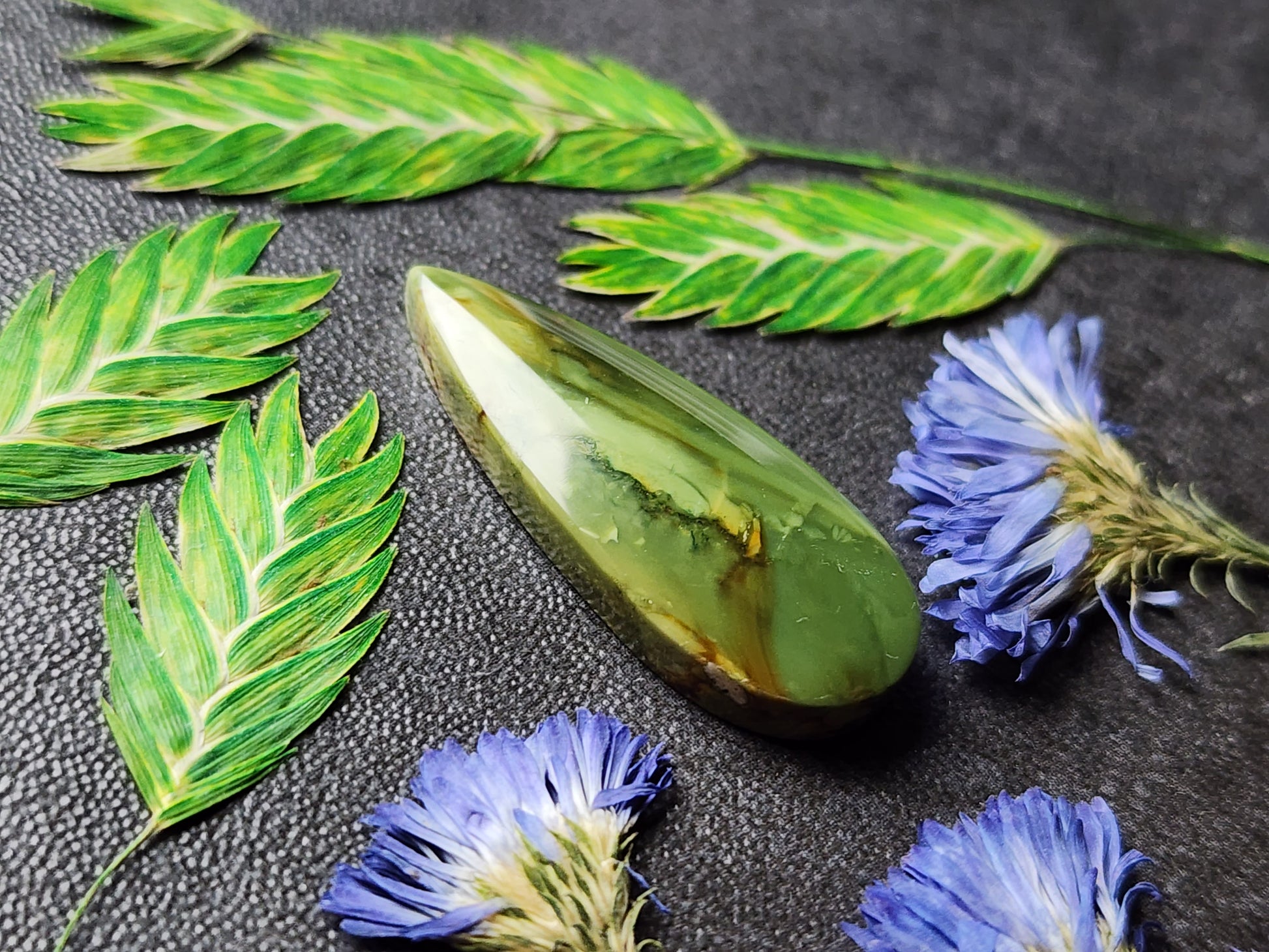 A rare, no-longer-mined jasper from the Morrison Ranch area in the Owyhee Mountains (Oregon–Idaho border). Formed in rhyolitic volcanic rock, it’s known for its tight painterly patterns, fine lines, orbs, and strong color contrast. Colors range from sage green and gold to rust, cream, mauve, and deep teal. With a hardness of ~6.5–7, it’s a dense, stable material ideal for cabochons. Because the deposit is closed and no new rough is produced, high-grade Morrisonite is highly collectible and each piece is one-of-a-kind.